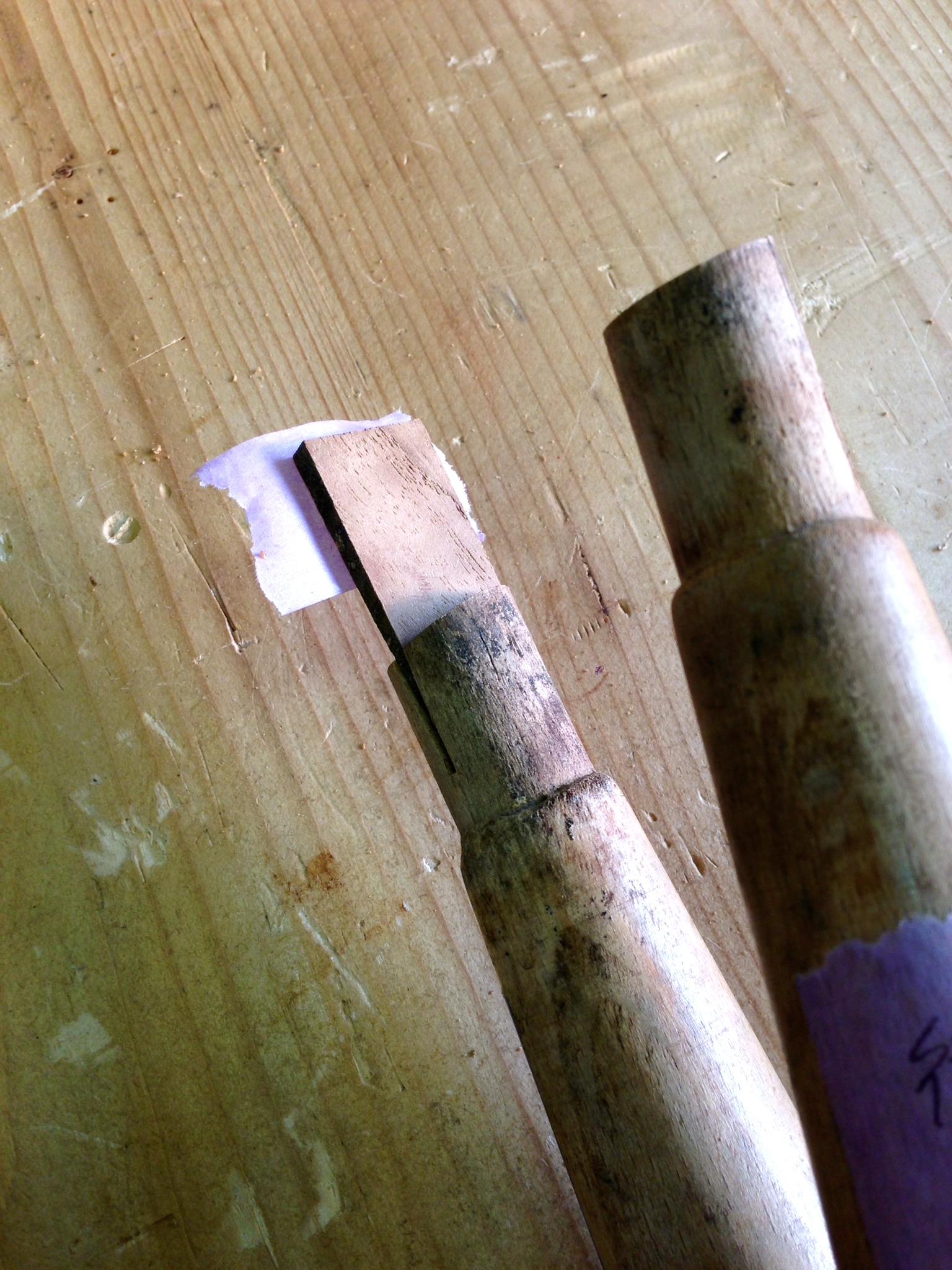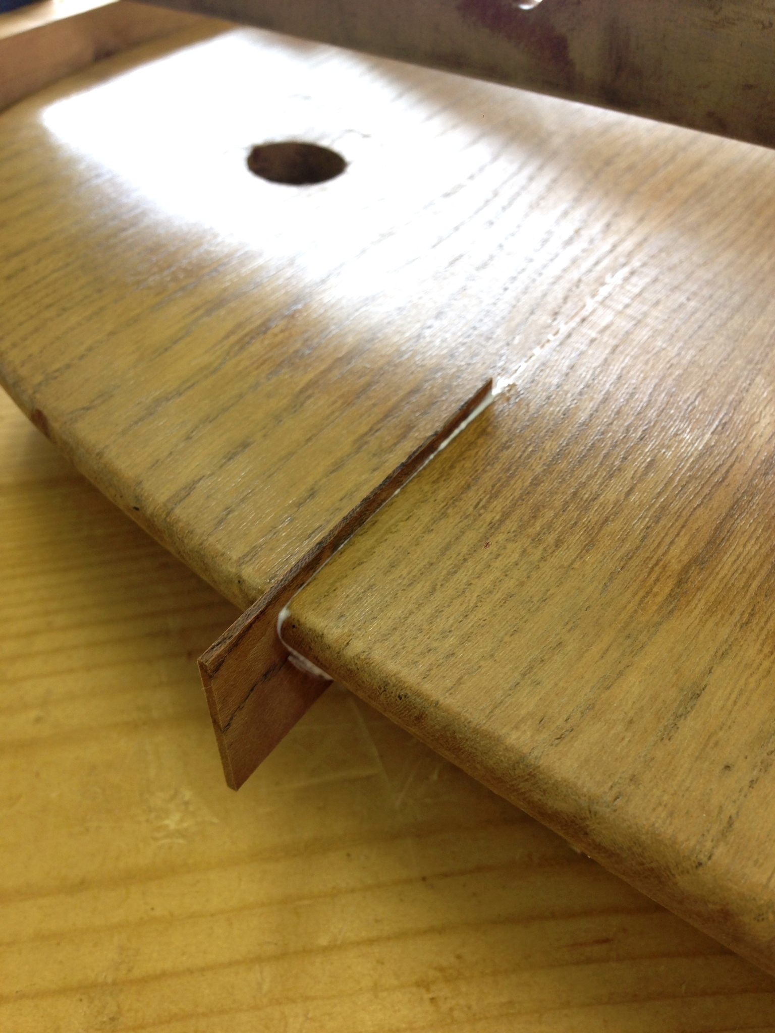 座面も痩せて割れかかっていたので、隙間に楔を入れ再接着。楔は座面と同じ古いエルムの端材製。